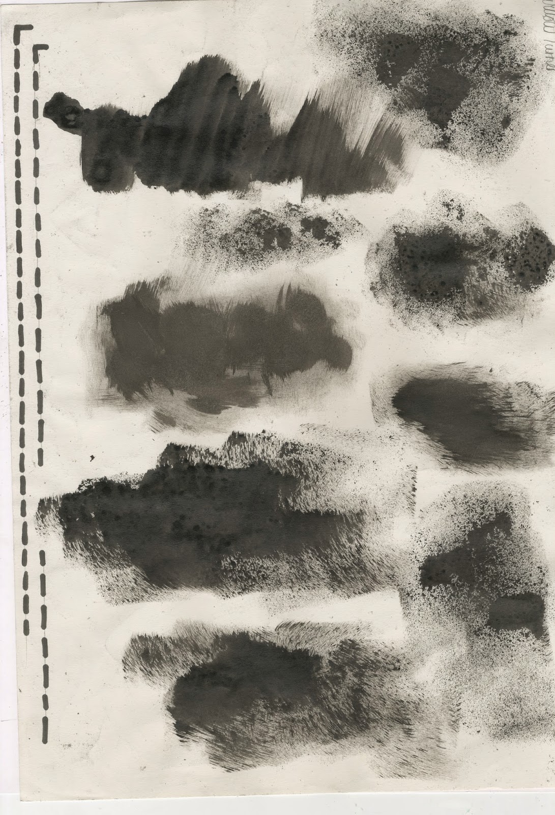 To start doing this i took a sponge, dipping it in ink and making different splodges and marks on the page. I also used a white board marker to create the dotted lines that went down the sides of the image.